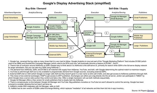 Google owns myriad consumer properties like Google search, Gmail, Chrome browser, Google applications, and YouTube—the biggest video site on the planet ($15B). But those are just the products consumers see. What they don’t see is the “invisible” technology and operating systems owned and operated by Google, the “plumbing”, that almost every buyer and seller of advertising uses. These “pipes” control the flow of money and data across the entire web ecosystem—Android, DV360, AdMob, AdSense and AdX, to name a few.
