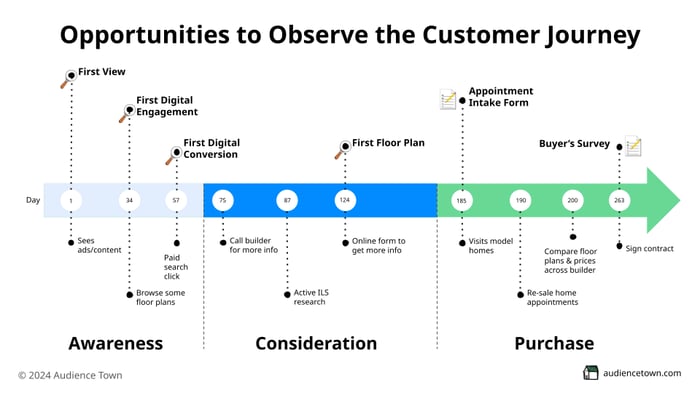 - Customer Journey Mapping: Track potential buyers' steps, from viewing floor plans online to visiting model homes and filling out contact forms. Recognize that the journey is often longer than expected. Many prospects are likely viewing your site months before they ever interact; we’re seeing time frames of 124 to 290 days from initial interest to form submission.