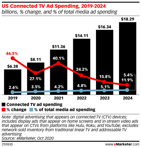 US CTV ad spending will increase 40% to $11.3 billion in 2021 (eMarketer)