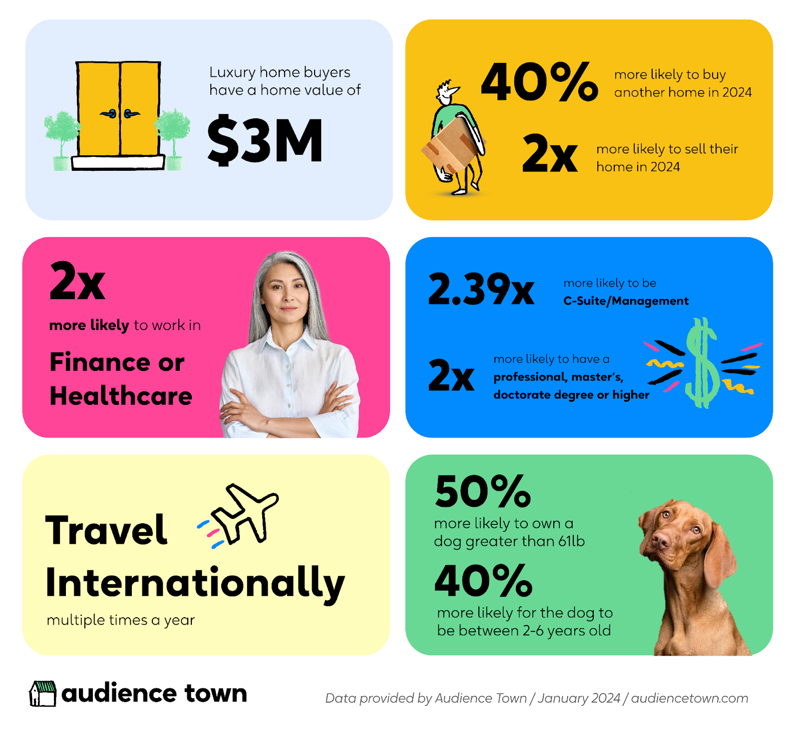 This edition is all about one of real estate’s favorite audiences - the luxury buyer. In fact, Audience Town’s consumer data reveals that in 2024 the wealthiest individuals are far more likely to move homes because they can transact in cash, can rent for more money, or already have substantial home equity. Notably, the affluent demographic is projected to be 40% more inclined to purchase another home this year and 2x as likely to sell their current residence.