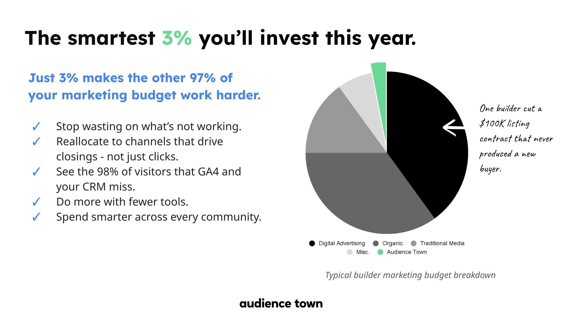 At Audience Town, we talk about this all the time: builders typically spend about 3% of their marketing budget on our platform. But that 3%? It's what makes the other 97% actually work. It's honestly the smartest money you'll spend all year, and I want to show you why.