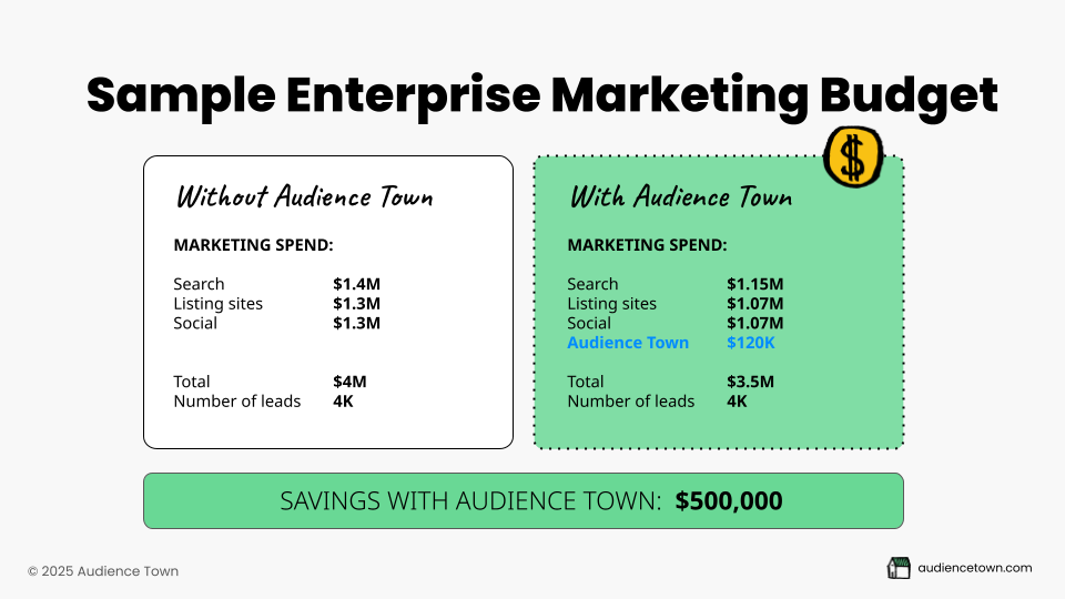Builders discover all the time that expensive listing providers or ad networks aren't actually generating new leads. One builder found that a $100K listing contract produced zero net-new buyers. They cut it in half and saved more than enough to cover Audience Town for every single community.