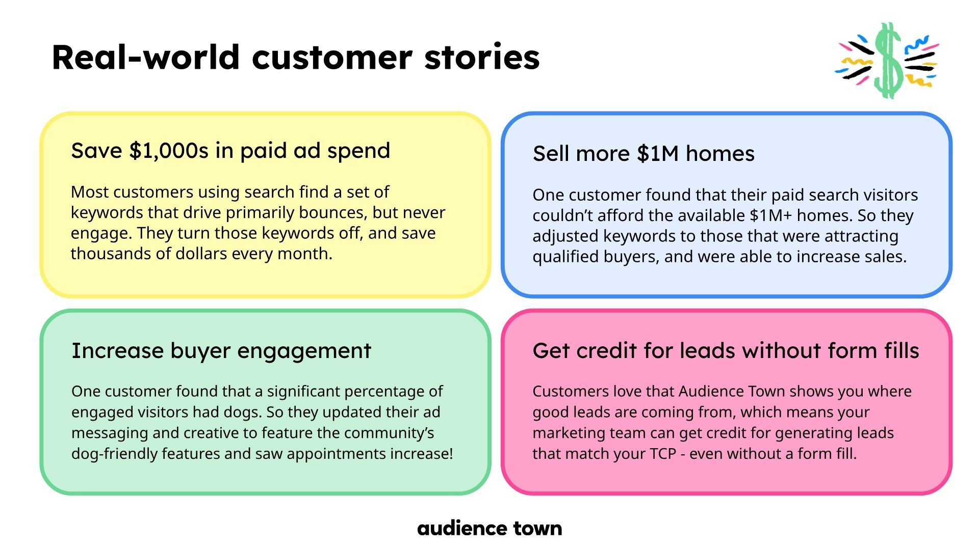 Replace gut feelings with proof. Attribution and buyer data from Audience Town make it crystal clear which channels deserve more investment (and which ones don't).